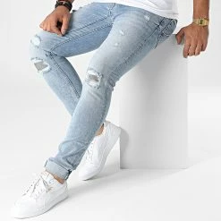 • Jean skinny tendance finition délavée et usée avec rapiéçages